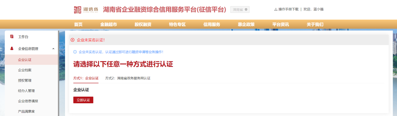 4、在企業(yè)實(shí)名認(rèn)證頁面,選擇認(rèn)證方式(企業(yè)認(rèn)證:需上傳營(yíng)業(yè)執(zhí)照信息,湖南省政務(wù)服務(wù)網(wǎng)認(rèn)證:需在湖南省政務(wù)服務(wù)網(wǎng)開通了賬號(hào)),并按照認(rèn)證流程進(jìn)行操作。