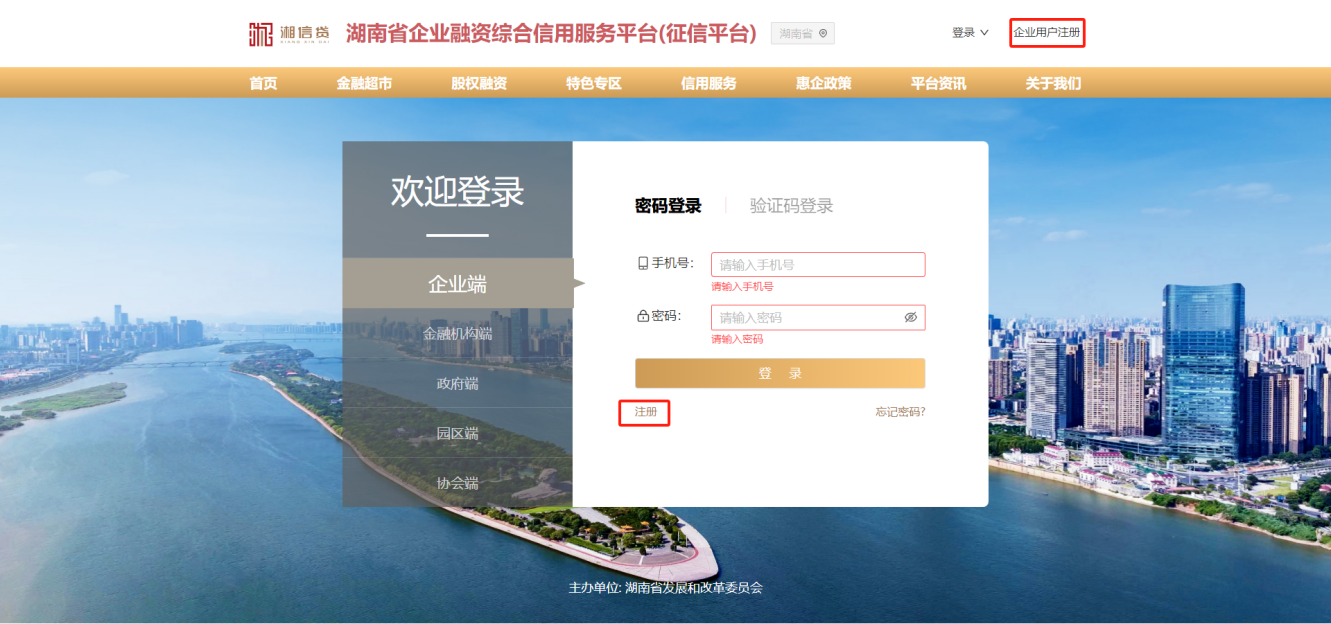 1、在“登錄頁面”左下角點(diǎn)擊“注冊(cè)”按鈕或在“湘信貸”平臺(tái)網(wǎng)站右上角,點(diǎn)擊“企業(yè)用戶注冊(cè)”按鈕,進(jìn)入注冊(cè)頁面。